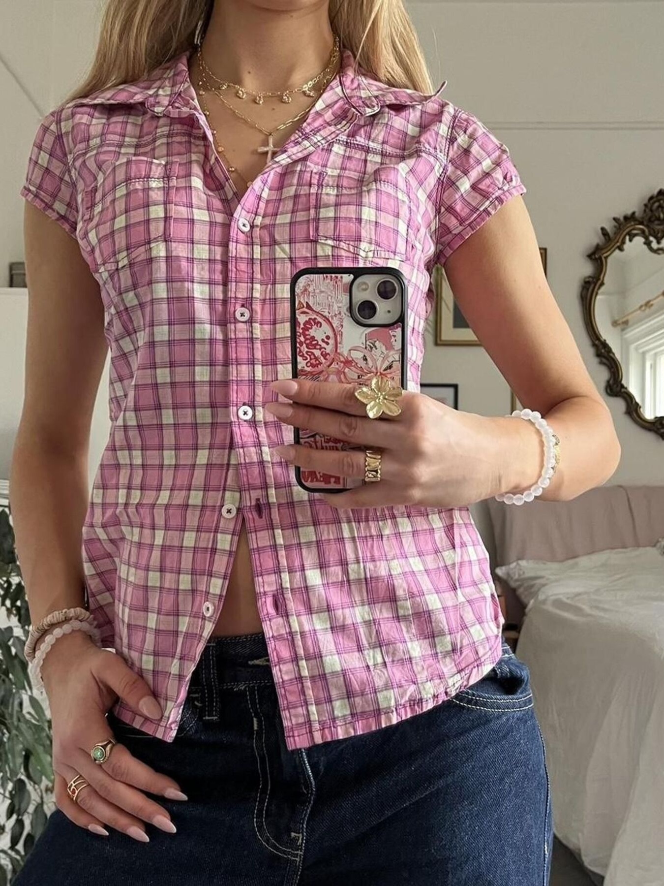 Plaid Cap Sleeve Button-Up Shirt