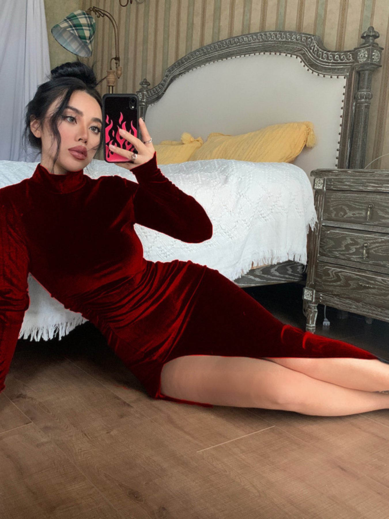 Velvet High-Neck Slit Dress