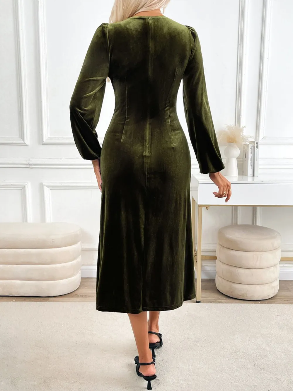 Perfee Slit V-Neck Long Sleeve Midi Dress
