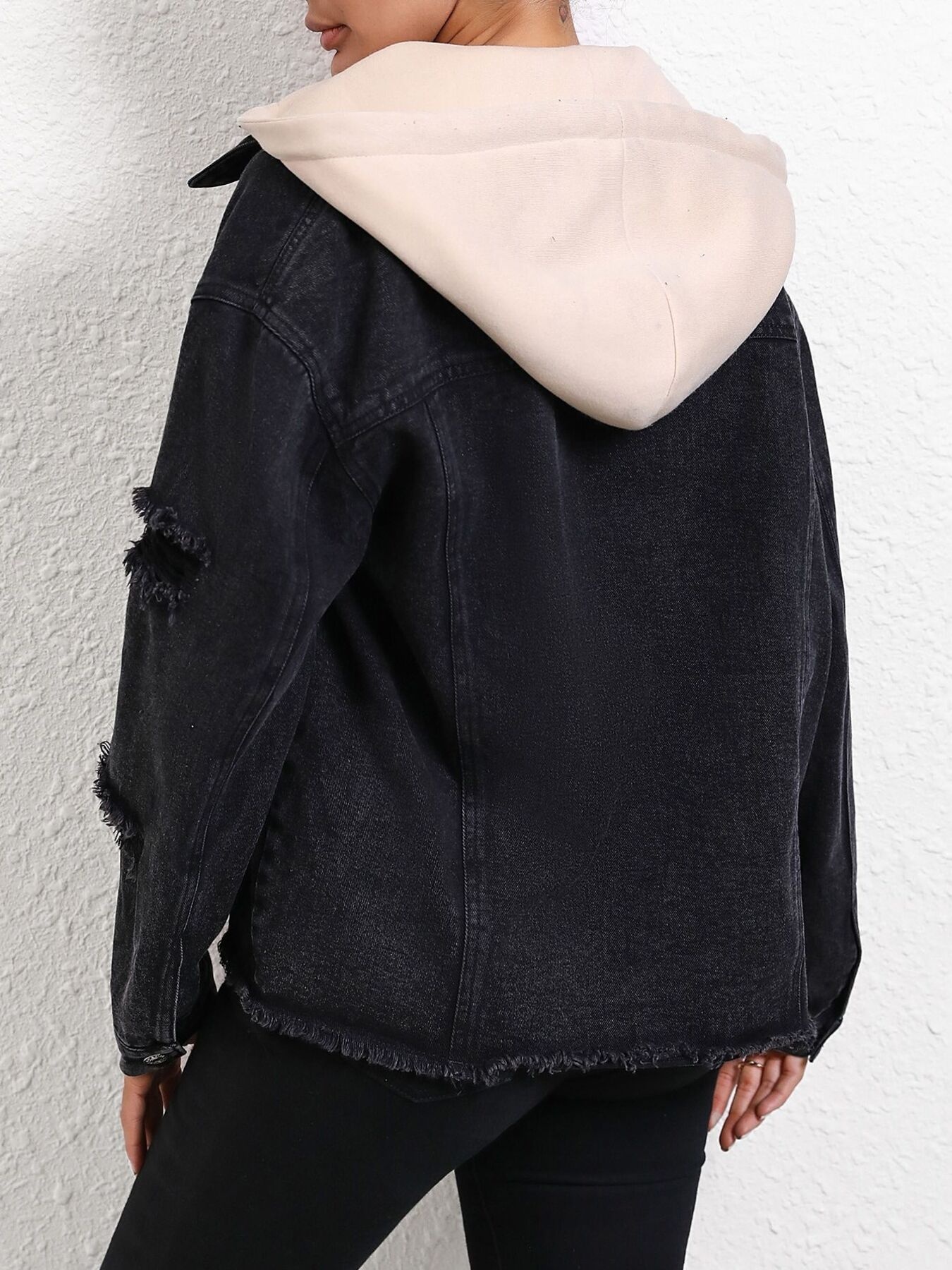 Distressed Drawstring Button Up Hooded Denim Jacket